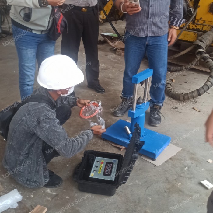 Digital Point-load Test Apparatus EN DD ENV 1997-2, ASTM D-5731. Originally developed at Imperial College, London, the apparatus comprises a two-column fixed crosshead frame and a hand operated hydraulic jack. Pressure applied by the jack extends the piston carrying the lower conical point.The upper point is fixed to the crosshead with a scale mounted on the frame to provide specimen diameter information for use in point load strength index calculations. Pressure is indicated directly on the digital readout unit. Loads up to 55 kN can be applied to specimens as