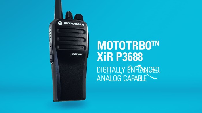HT ( Handy Talkie ) MOTOROLA XIR P3688 adalah HT keluaran terbaru dari MOTOROLA untuk menggantikan HT MOTOROLA GP3188 dan HT MOTOROLA GP328 yang sudah habis masa berlakunya ( Discontinue ), HT ini tersedia dalam pilihan 3 frekuensi yaitu : VHF, UHF dan UHF Low